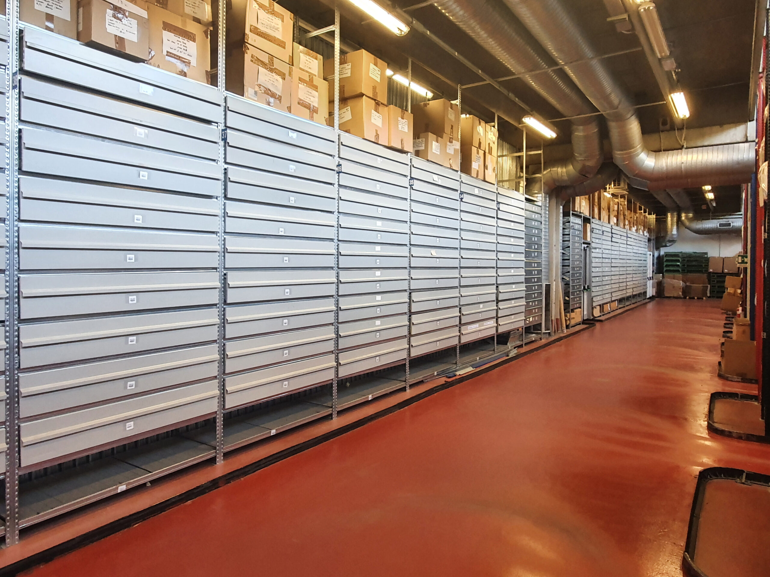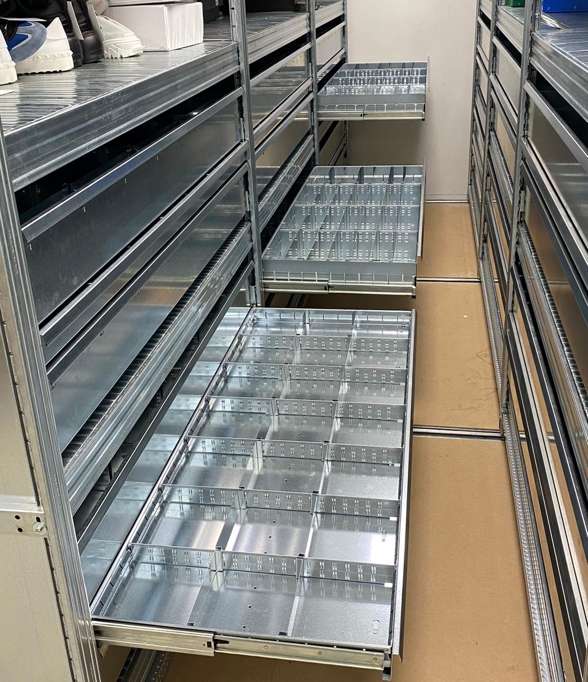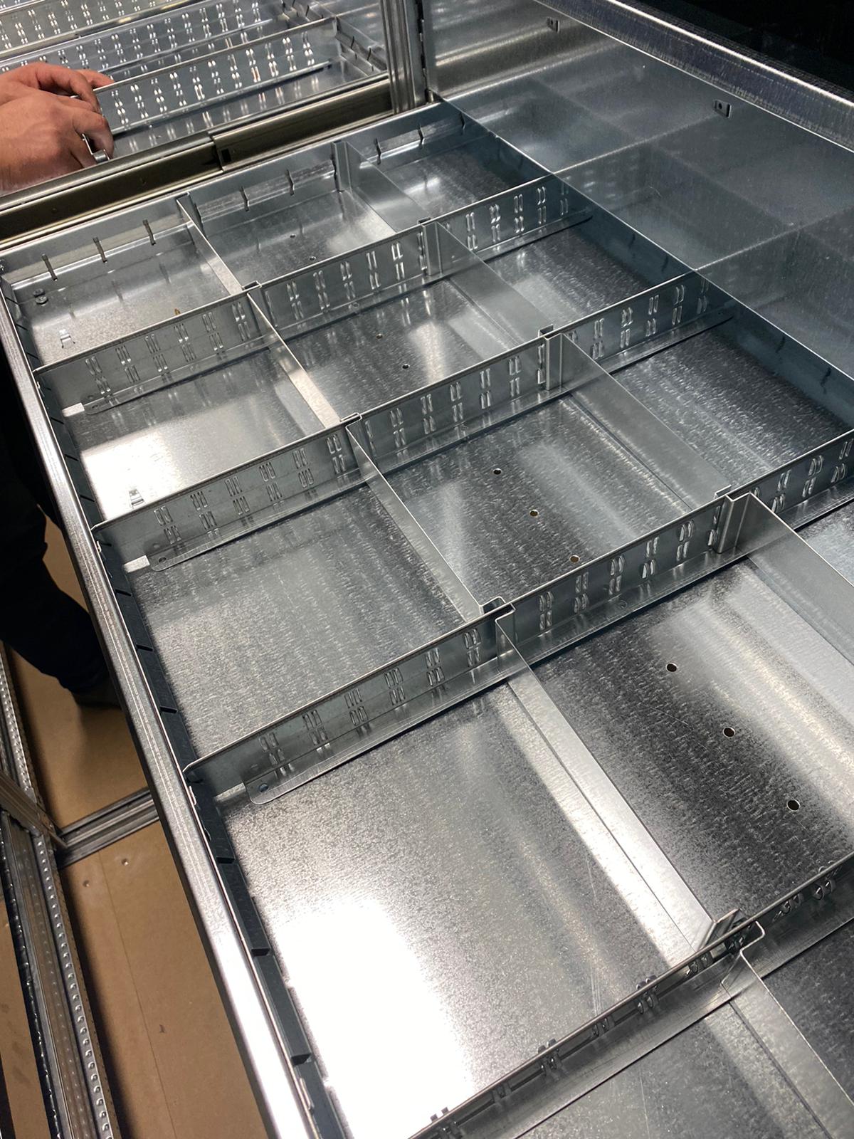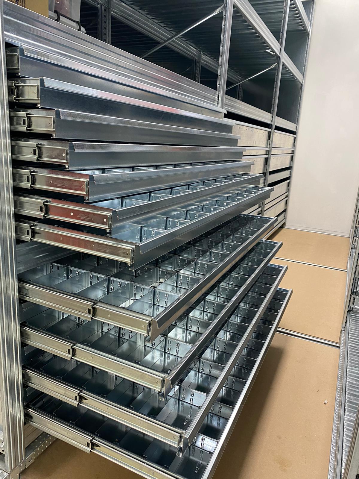 Costruite per essere montate in qualsiasi sezione della scaffalatura, le cassettiere sono dotate di guide agganciate alle spalle che ne assicurano stabilità e sicurezza.
