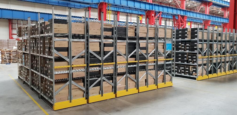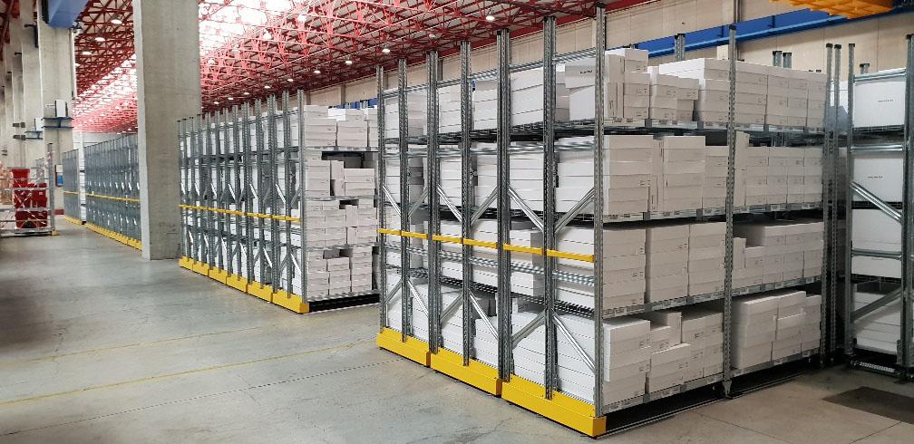 Il sistema Mobyeasy consente di convertire rapidamente scaffalature fisse in impianti mobili scorrevoli su binari, ottimizzando la gestione dello spazio e riducendo il numero di corridoi necessari tra i filari.