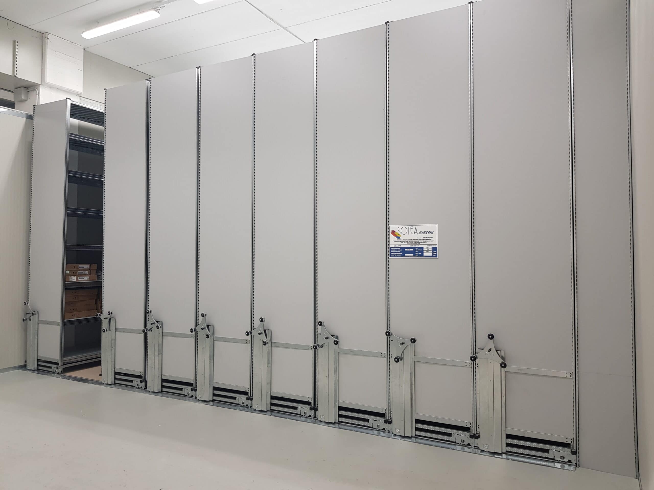 Il sistema utilizza ripiani tradizionali montati su basi mobili carrellate che scorrono manualmente su binari tramite un volantino di guida. Ciò consente di aprire il corridoio solo dove necessario, eliminando corridoi fissi tra ogni filare e ottimizzando lo spazio di archiviazione.