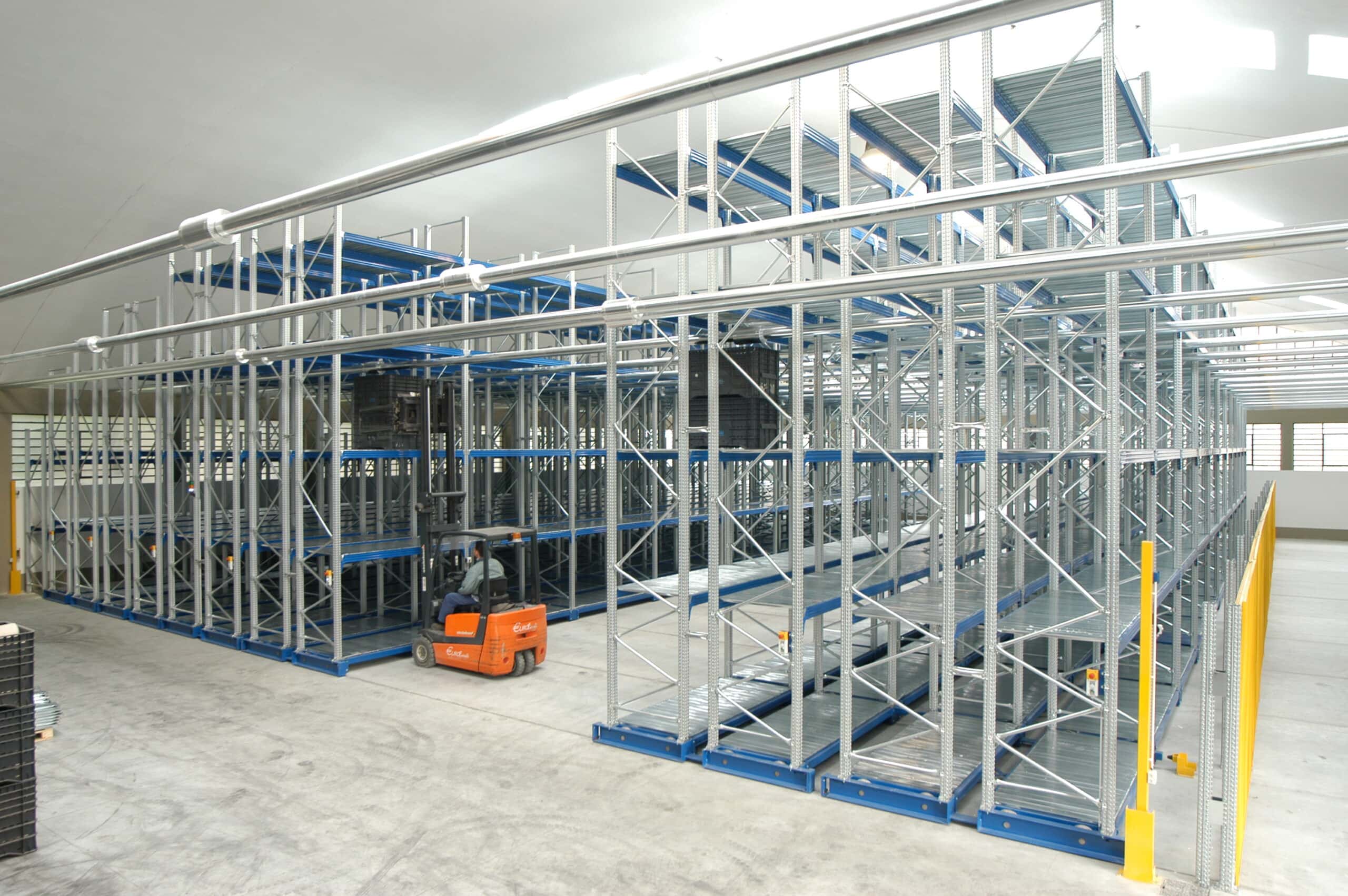 Il sistema utilizza scaffalature tradizionali montate su basi mobili carrellate che scorrono su binari. Ciò consente di avere un solo corridoio di lavoro ogni due filari, ottimizzando lo spazio disponibile.