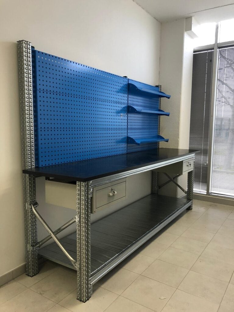 The system consists of by modular profiles that can be assembled to integrate Laminate or steel tops, shelves, drawers and other customized accessories. Modularity makes it easy to configure size and scope Of locations according to operational needs, optimizing ergonomics and workflow. The structures are robust, versatile and adaptable to different sectors, ensuring durability and the possibility of future modifications without complex interventions.